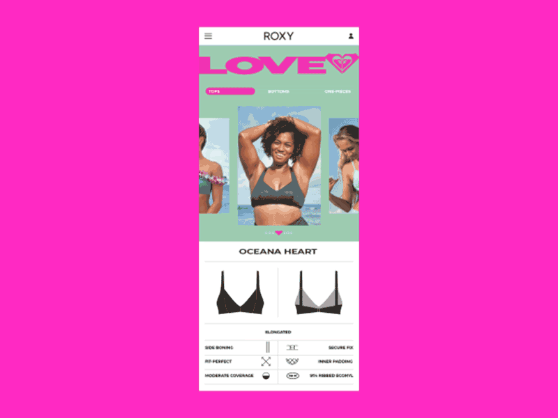 The bold letterforms of the Roxy LOVE logotype are hand cut and magnetised together, reflecting the Roxy brands values of togetherness and body inclusivity. The motion design needed to bring to life a playful, carefree yet purposeful brand expression. I did this by focusing on the elasticity and flexibility of the forms - developing a “squish” device that could be iterated across the various assets including tone of voice and UX.